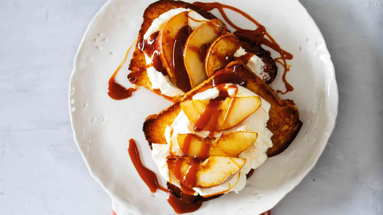 Na pomazánku promíchejte smetanový s mascarpone a lehce oslaďte. Hrušky nakrájejte na osminky a opečte na másle. Briošku opečte na troše másla na pánvi nebo nasucho v toustovači, potřete pomazánkou, poklaďte hruškami a pokapejte karamelem.