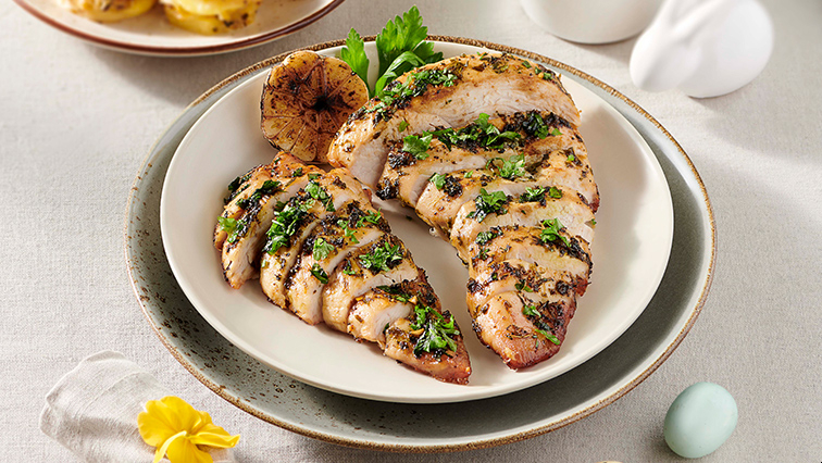 Krůtí prsa nakrájíme na silnější plátky a ze všech stran je potřeme připravenou směsí. Maso vložíme do zapékací mísy a položíme na něj zbylé dva stroužky česneku a tři větvičky rozmarýnu.