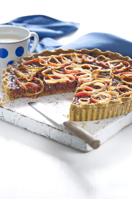 Oloupané a na kolečka nakrájené cibule zvolna opečeme na oleji asi 15 – 20 minut, dokud nezačnou karamelizovat. Řepy oloupeme, nastrouháme, nasypeme na dno korpusu a zasypeme opečenou cibulí.