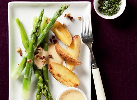 Chřest rozdělíme na talíře a přidáme omáčku, do které vmícháme těsně před podáváním nasekanou petržel. Nakonec chřest posypeme ořechy.