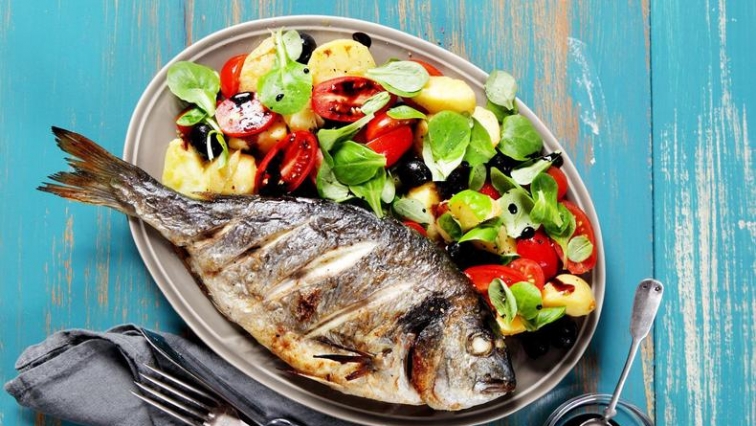 Grilovaná pražma s bramborovým salátem, cherry rajčaty a olivami