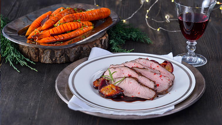 Po dopečení maso vyndáme a necháme odpočinout, následně ho nakrájíme. Servírujeme se švestkovou omáčkou z hrnce a s mrkví Hasselback.