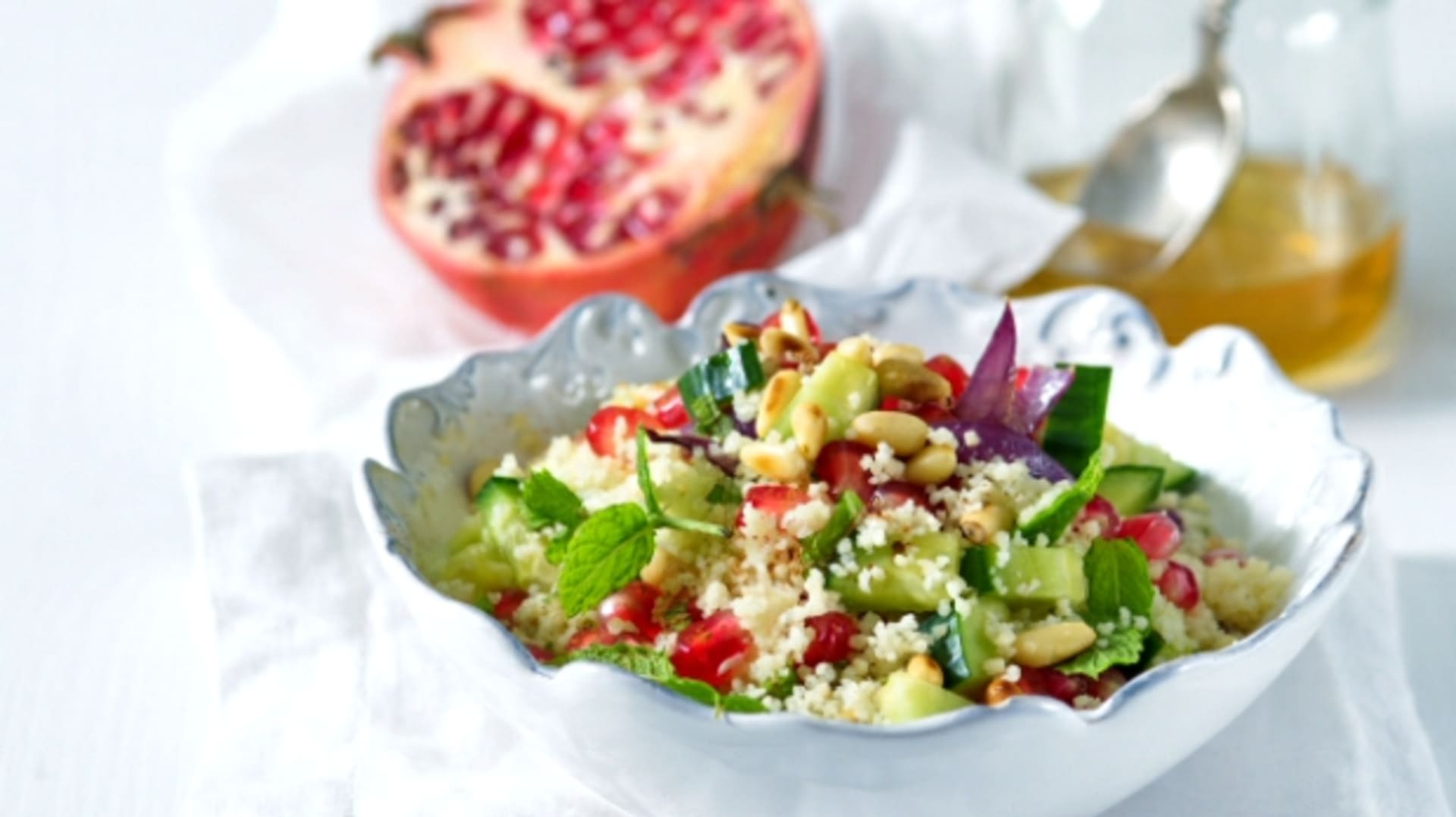 Do kuskusu (pozor, všechna voda se musí vstřebat) dobře zamíchejte 2 lžíce oleje. Kuskus by se neměl lepit a měl by mít „vzdušnou“ strukturu. Potom přimíchejte zbylé ingredience – zkaramelizovanou cibuli, nadrobno nasekanou mátu, opražené piniové oříšky, okurku a granátové jablko. Salát dochuťte solí, pepřem a špetkou skořice.