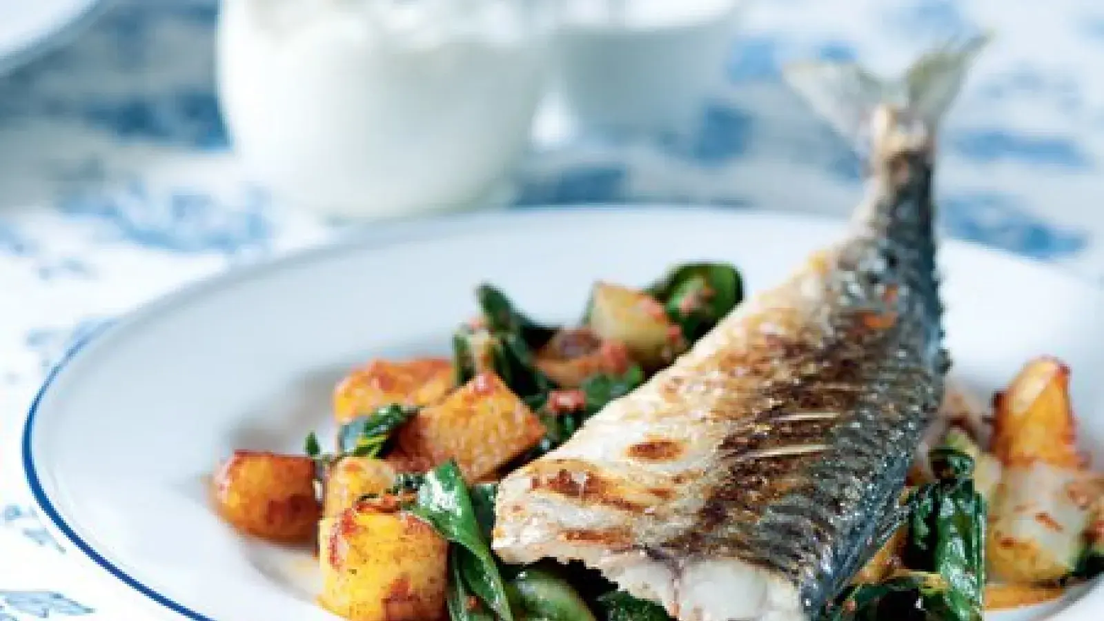 1 Z makrel odřízněte hlavu a odřízněte filety od páteře. Do kůže udělejte z boku 3 mělké zářezy, osolte, opepřete a potřete rybu jogurtem. Nechte 30 minut odpočinout.