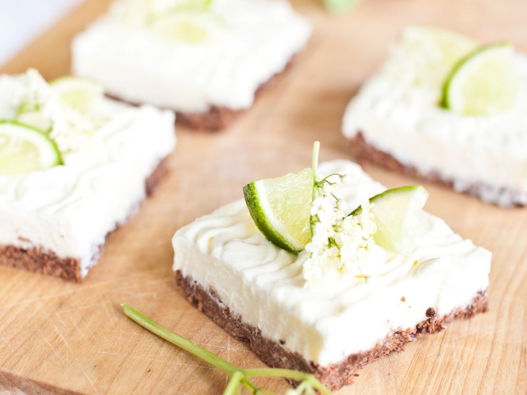 Krok 3: Hotový cheesecake krájejte na řezy a každý ozdobte tenkým plátkem limetky a bezovými květy.