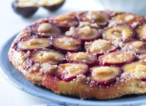 Koláč necháme 10 minut vychladnout ve formě, pak ho přiklopíme velkým mělkým talířem tak, aby okraje talíře přesahovaly formu, a koláč opatrně vyklopíme na talíř, takže nyní jsou švestky nahoře a těsto dole.