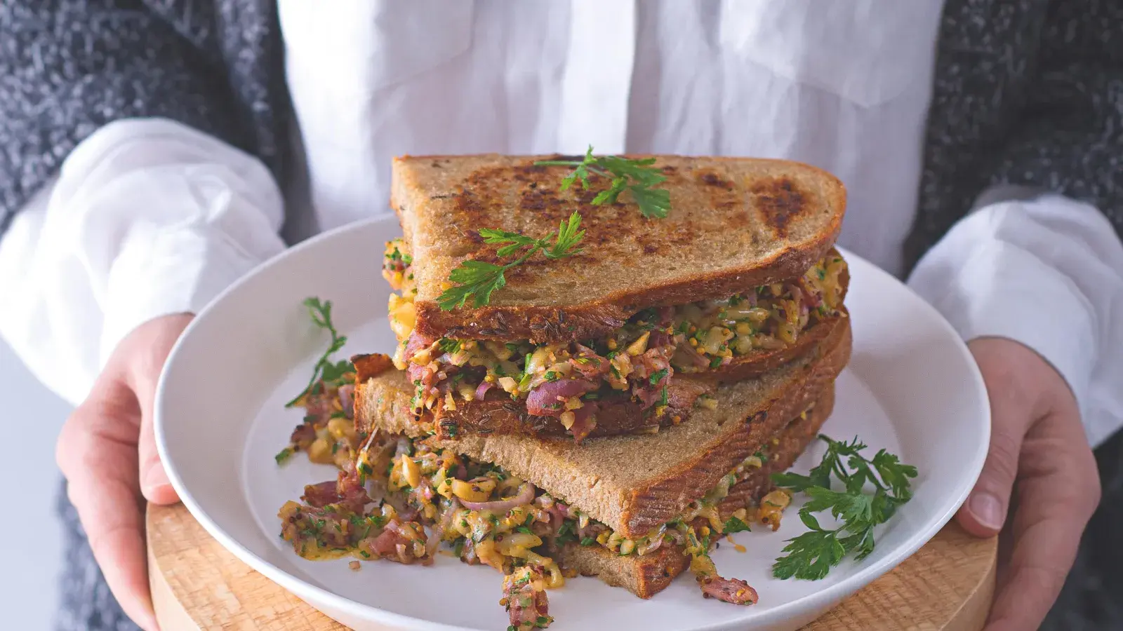 3 Na opečenou stranu navršte připravenou sýrovou směs (díky tomu, že je chleba horký, bude na něm lépe držet), přiklopte druhou polovinou chleba a pevně stiskněte k sobě.