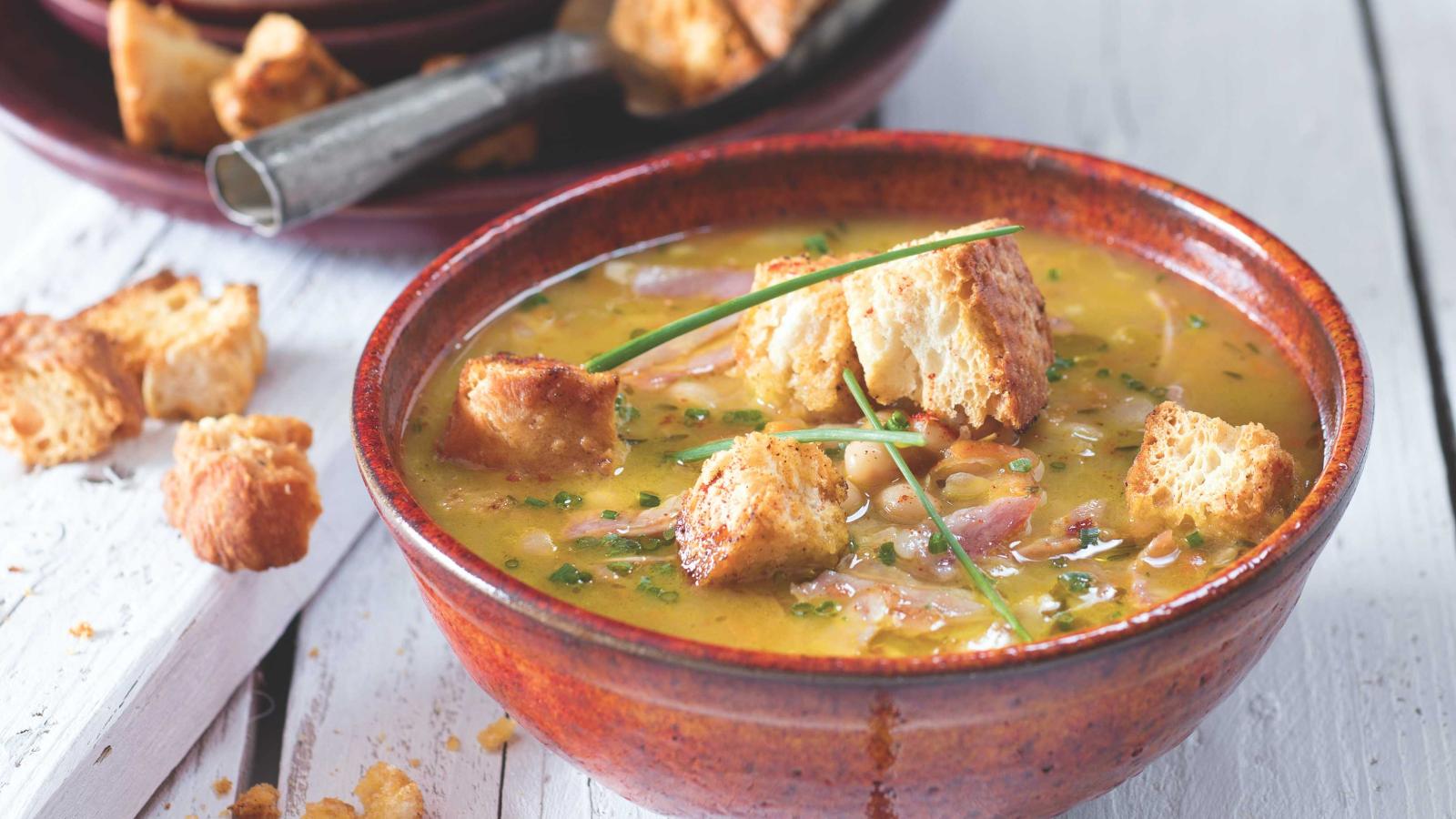 3 Z polévky odstraňte tymián. Vyjměte šunku, nakrájejte ji na centimetrové kostičky či plátečky a ty vraťte do polévky. Polévku ochutnejte, podle potřeby dosolte (možná to nebude nutné) a opepřete. Podávejte v nahřátých miskách, s paprikovými krutonky a pažitkou.