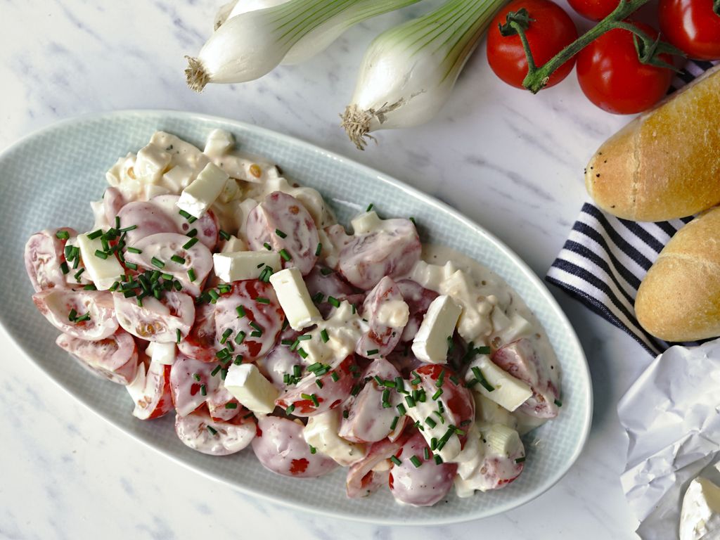 Krok 3: Zchladlé uvařené vejce a hermelín nakrájejte na malé kostičky, jarní cibulky nasekejte. Pak vše smíchejte s rajčaty a majonézou.