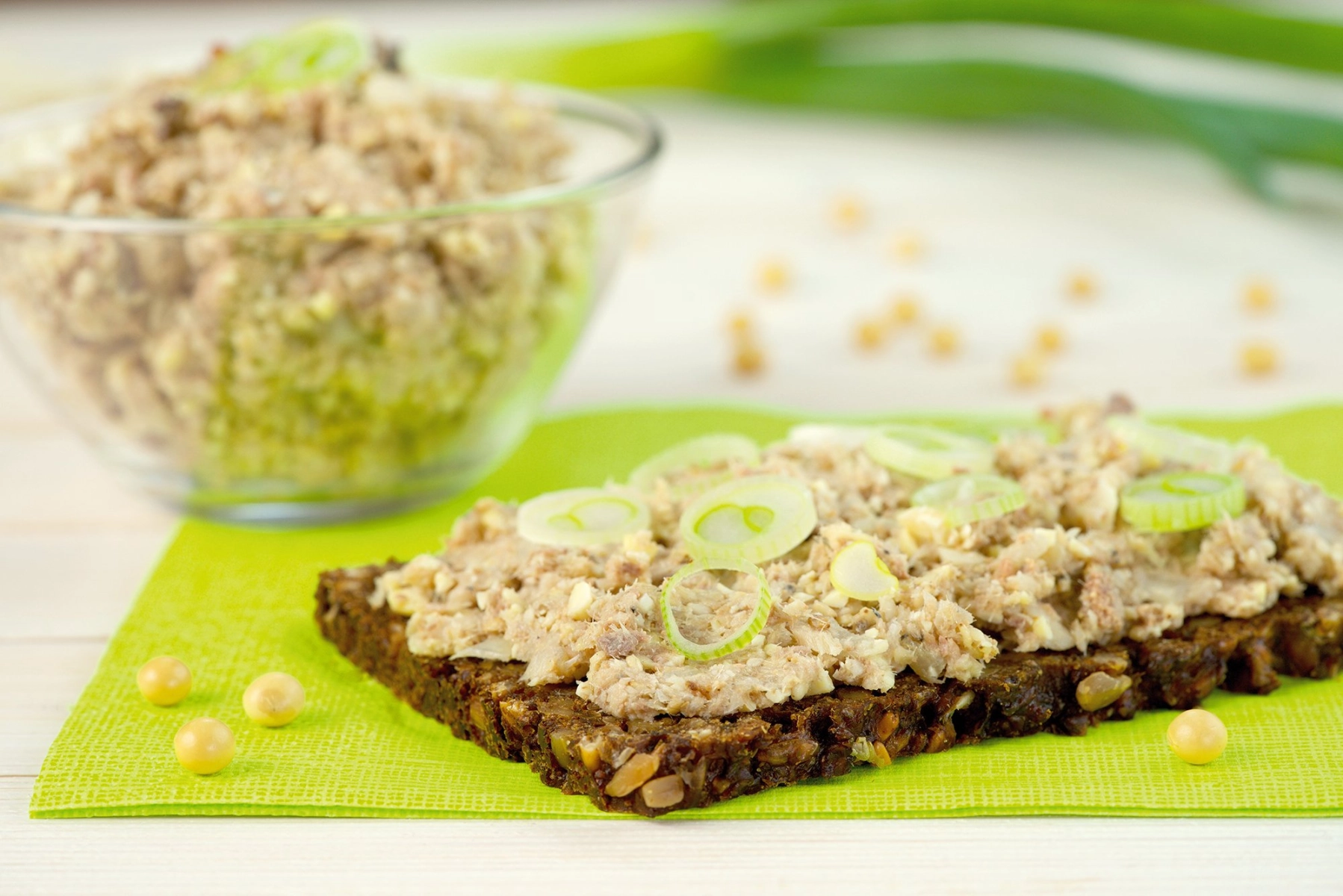 Pomazánku dochutíme solí a podáváme na celozrnném chlebu, který ještě můžeme posypat najemno nakrájenou jarní cibulkou.