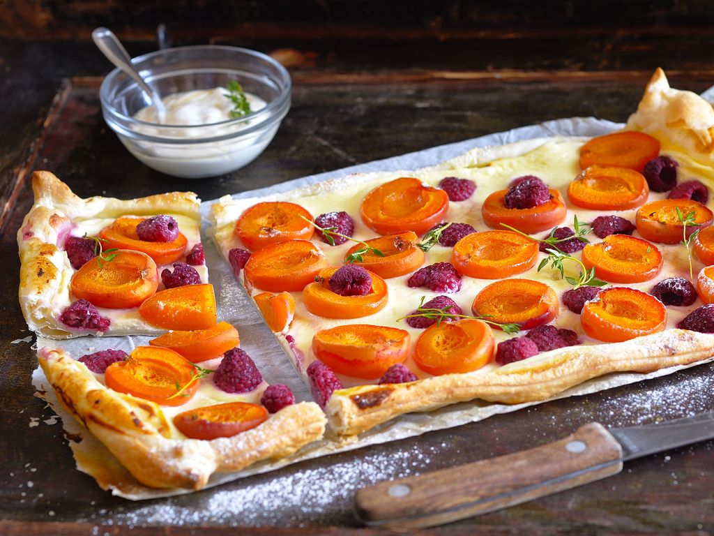 Krok 2: Těsto na několika místech propíchněte vidličkou a pak na něj naneste krém a rovnoměrně ho rozetřete. Navrch přidejte vypeckované meruňky a maliny.