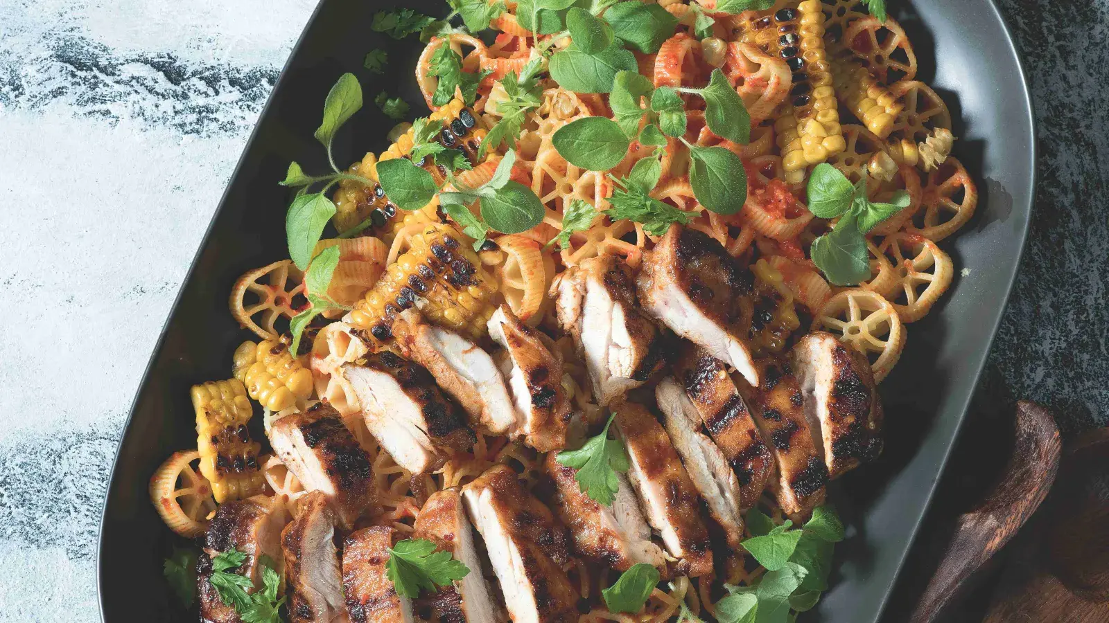 Na omáčku vložte všechny přísady kromě oleje do mixéru a rozmixujte, pak pomalu přilévejte olej do konzistence omáčky. Těstoviny smíchejte s částí omáčky (zbytek podávejte v mističce bokem), nandejte na servírovací talíř, přidejte kukuřici a posypte bylinkami. Kuře nakrájejte