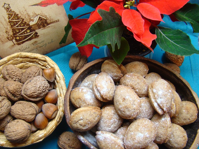 Ze surovin vypracujeme hladké těsto. Je hodně mastné a hůř se s ním pracuje, ale nepotřebujeme ho vyválet takže to není problém. Jinak se těsta dávají zatáhnout do lednice, aby se těsto nelepilo a při válení dotenka netrhalo… Těsto namačkáme do formiček a při 175°C upečeme. Trvá to kolem 15 minut, jen nechat lehce zezlátnout. Pár minut přetáhnete a je to hnědé 😉 Slepujeme troškou ořechového másla a uložíme v chladu.