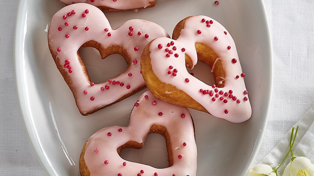 2. Těsto necháme kynout na teplém místě asi 30 minut, poté propracujeme a necháme nakynout na dvojnásobek. Rozválíme na plát silný 2 cm a vykrajujeme srdce o velikosti asi 10 cm se středem ve tvaru malých srdíček.