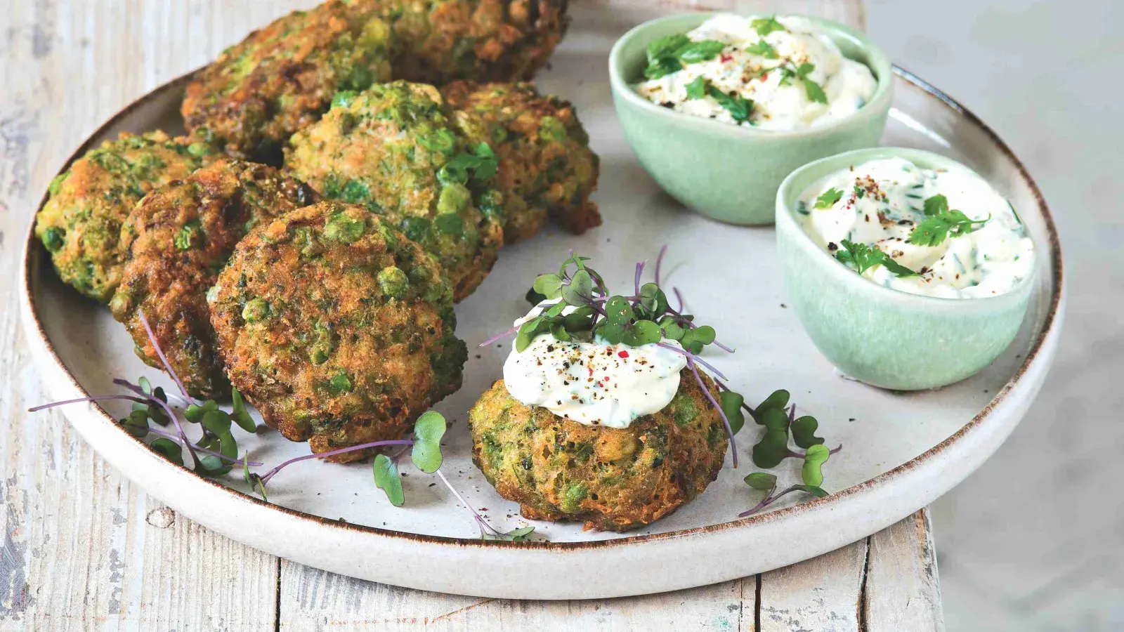 Zelené placičky z brokolice a hrášku s jednoduchým dipem